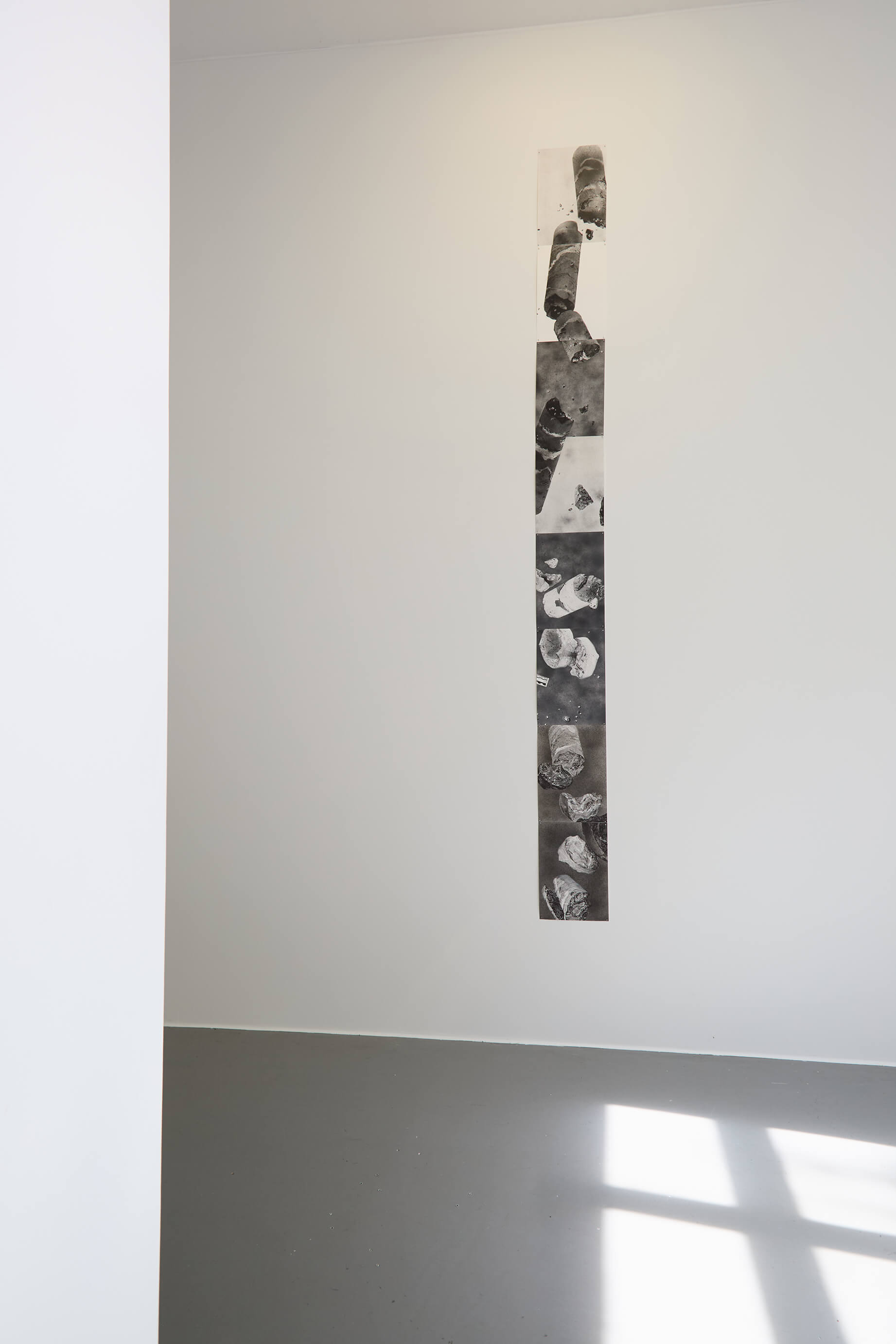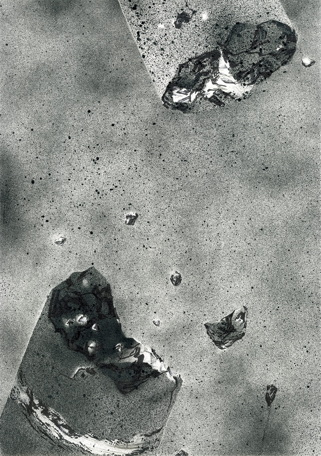The study of core samples provides scientists with essential information about the geological characteristics and coal distribution of specific regions. Coal is formed through the burial and transformation of carbon from plants which died millions of years ago, converted from peat and into coal through time and geologic pressure. In drawings, the cylindrical core sample appears to float as if defying gravity, with layers containing fossils of Lycopodium, ferns, and traces of coal. The grayscale background reflects the evolutionary processes of various materials within the geological strata. The ruler depicted in the piece not only measures the size of objects but also symbolizes the transmutation from ancient swamps to modern minerals.