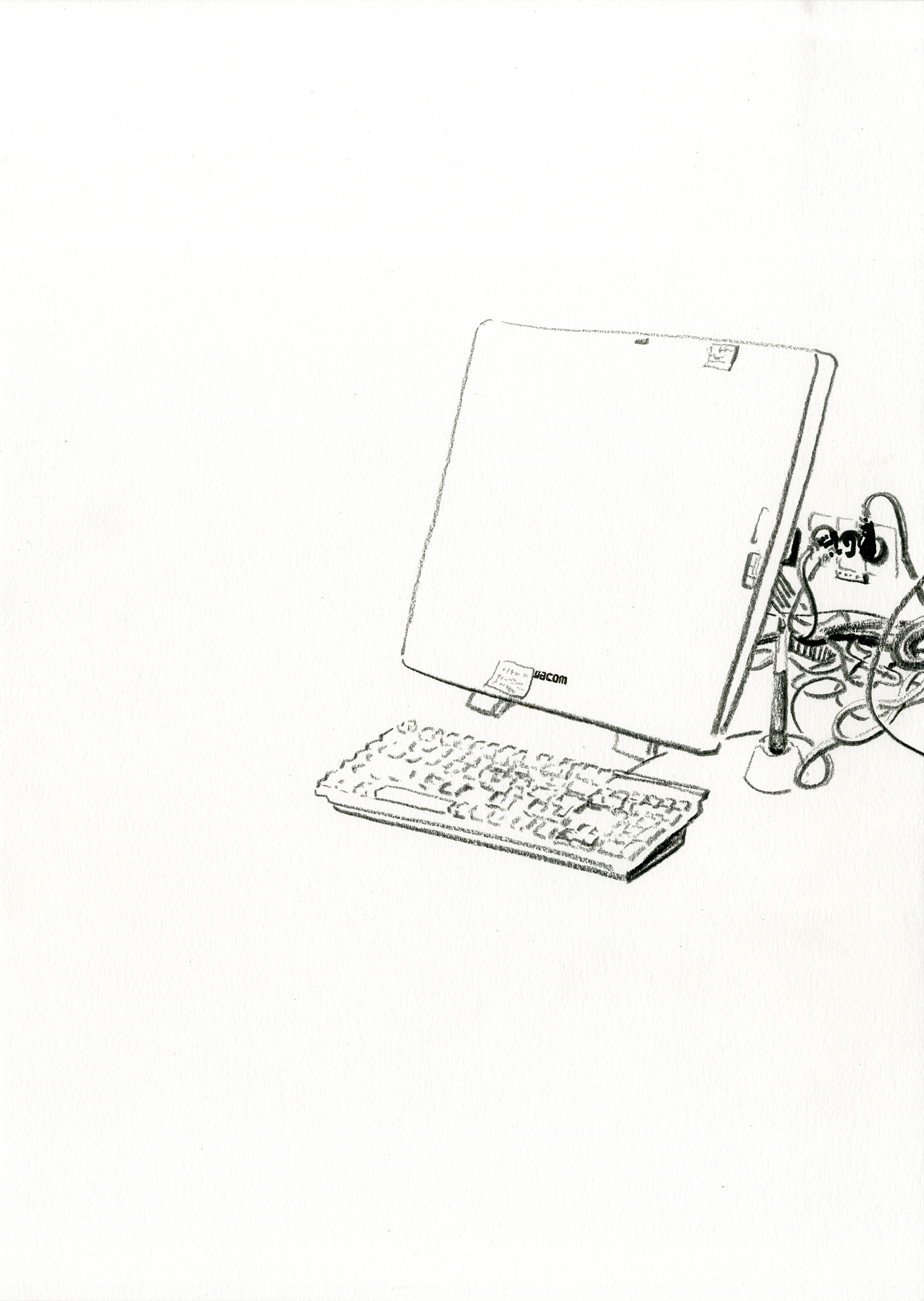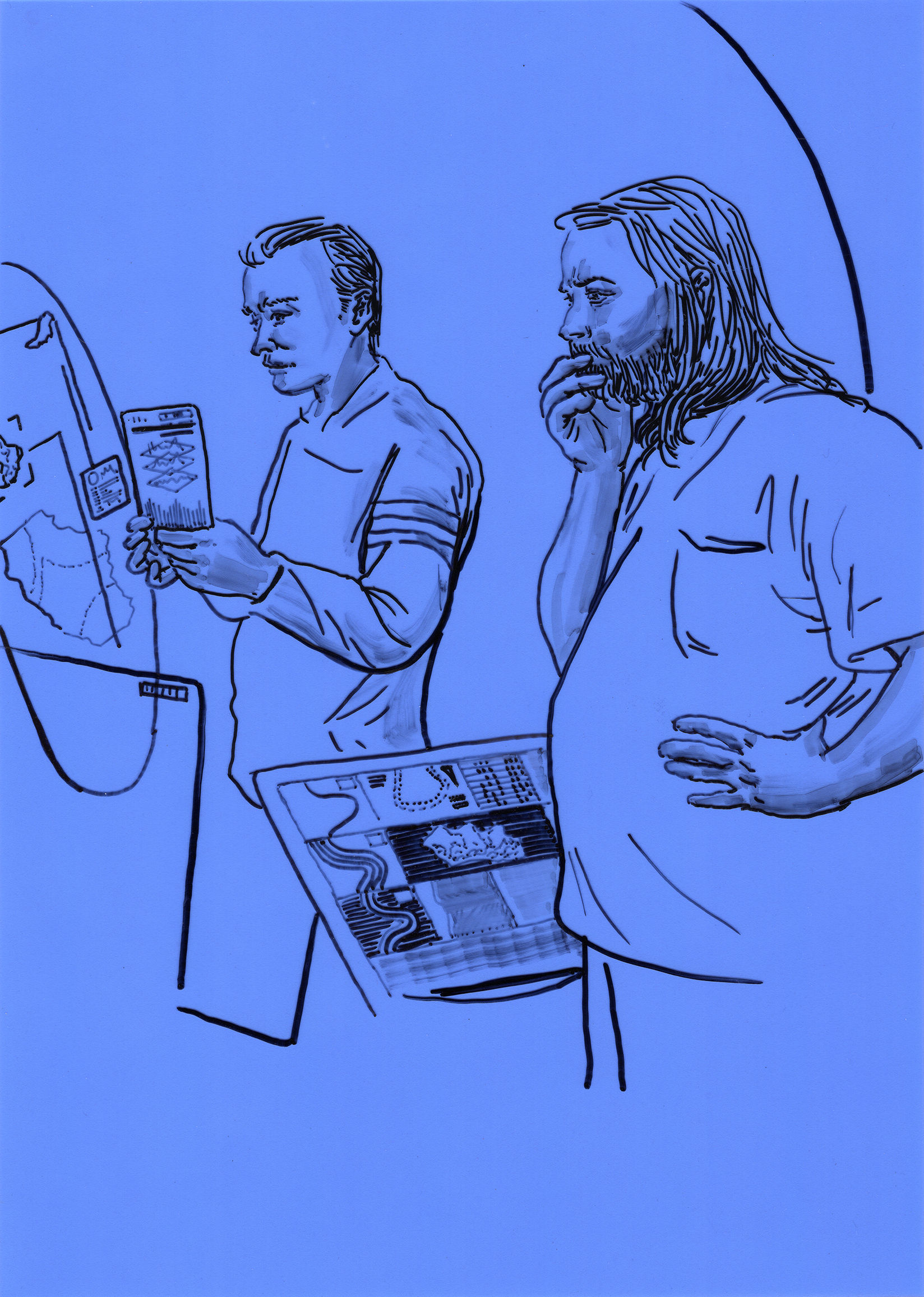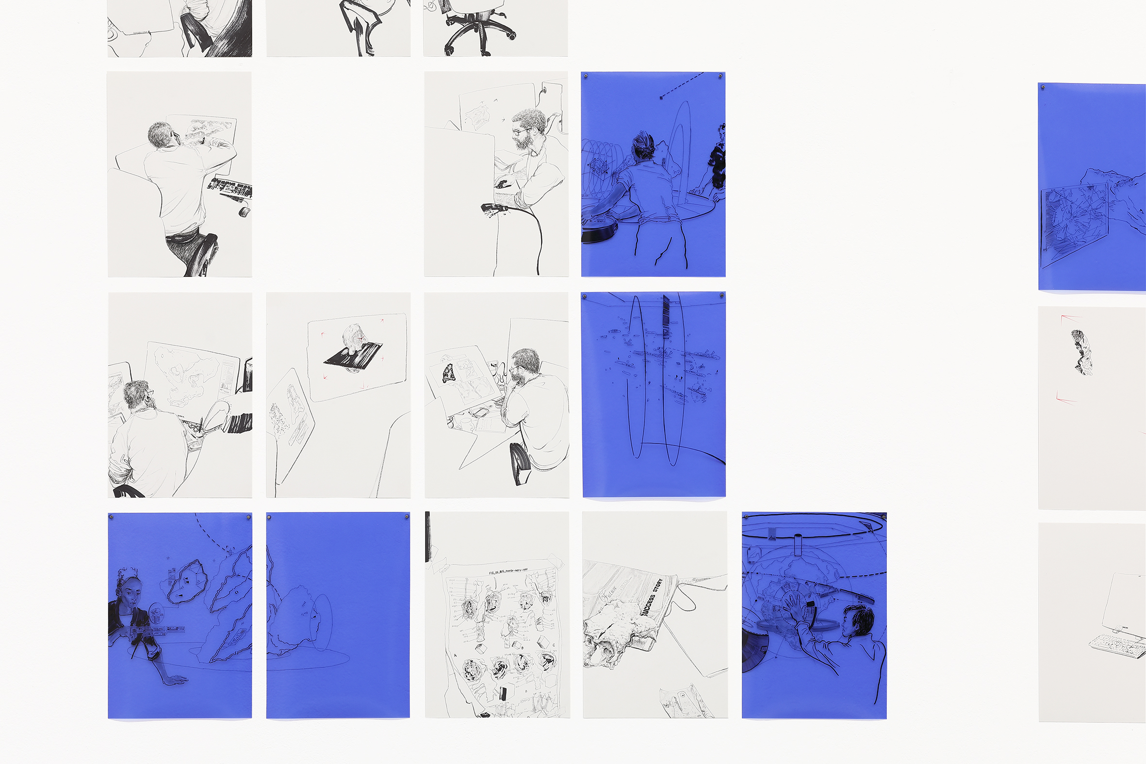 It consists of a series of drawings in which Zhou depicts paleontologists scanning fossil and archaeological finds. What is striking is that the scientists seems to pay more attention to the digitally produced computer image than to the actual stone. Zhou deepened and expanded his interest in the productive interplay between virtuality and real material, which he was able to observe in scientific research. A new series of drawings show scientists from a fictive world of research drawn with permanent markers on blue foils. They are at an even greater distance to their object of study that they seek to grasp all the more profoundly with observation methods of the future. Although they are investigating layers of rock and sediments, not a grain of sand, not a speck of dirt can be found underneath their fingernails anymore.