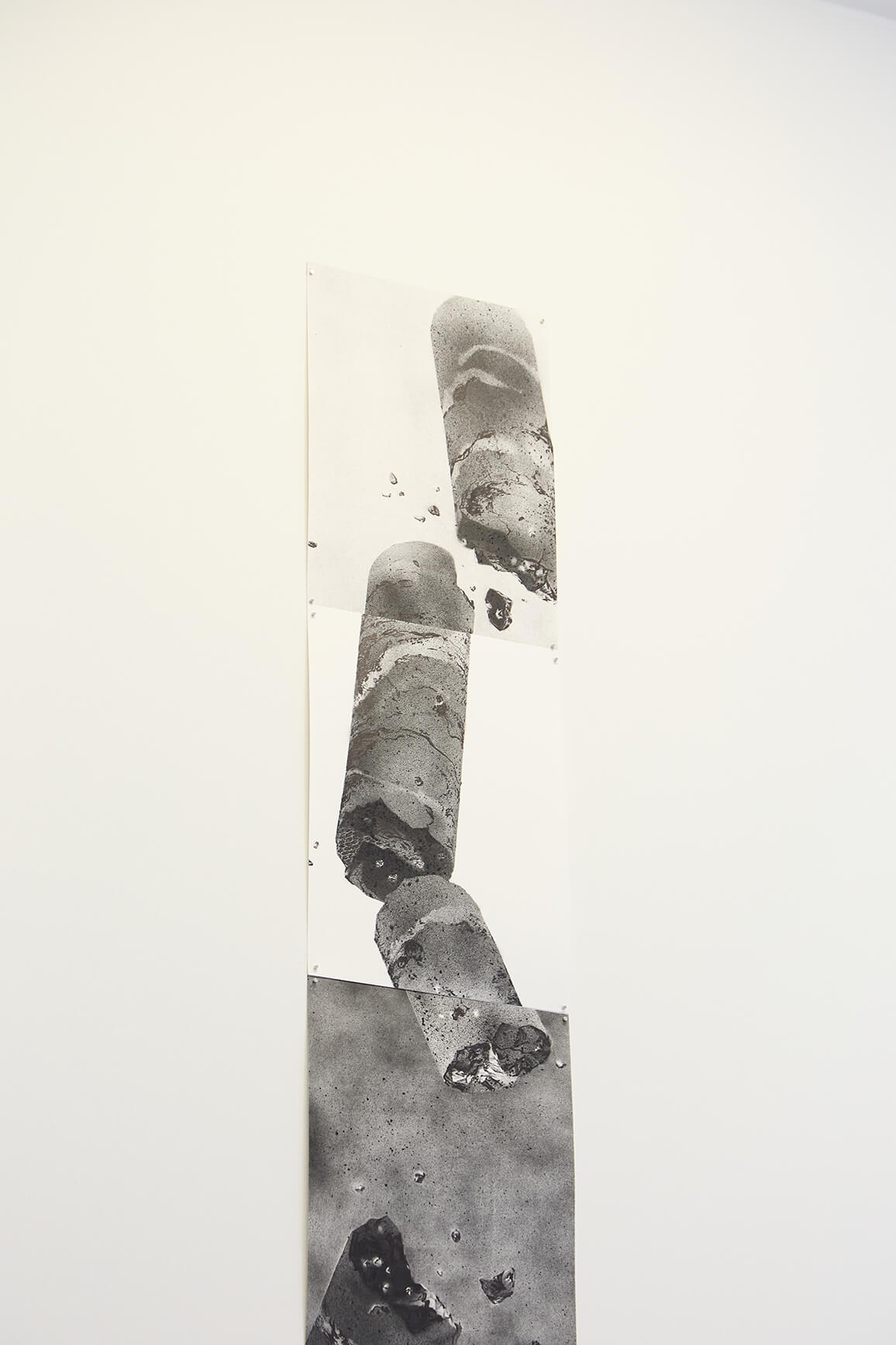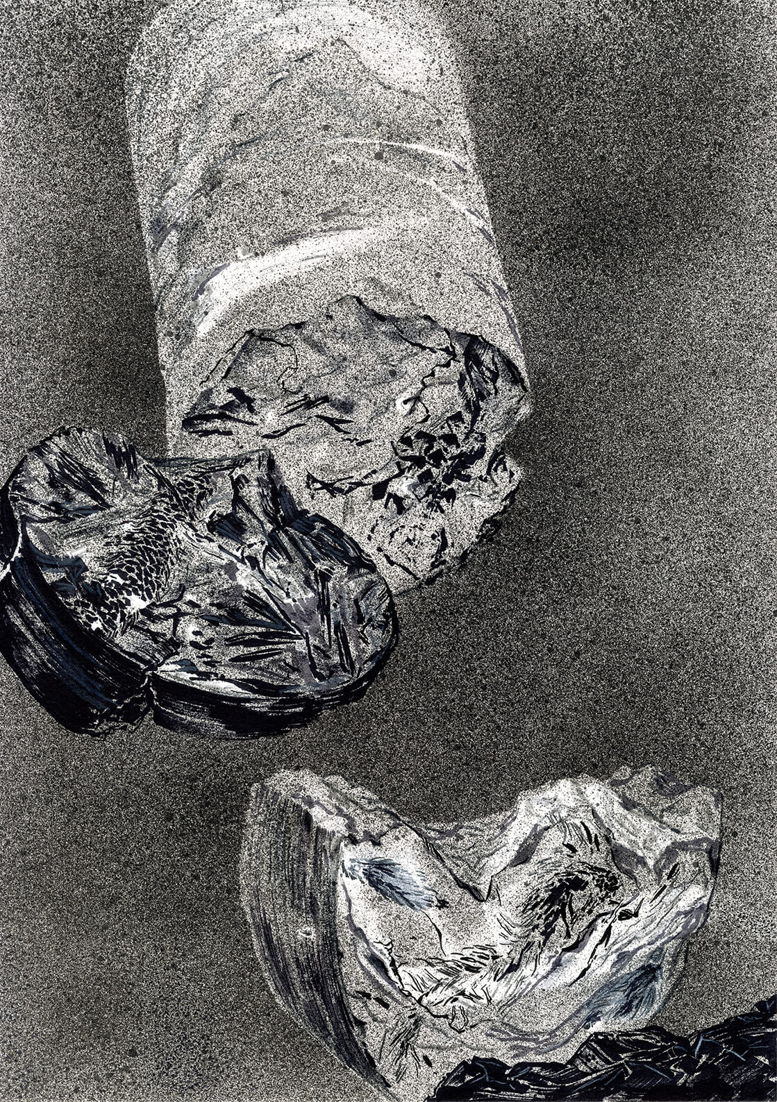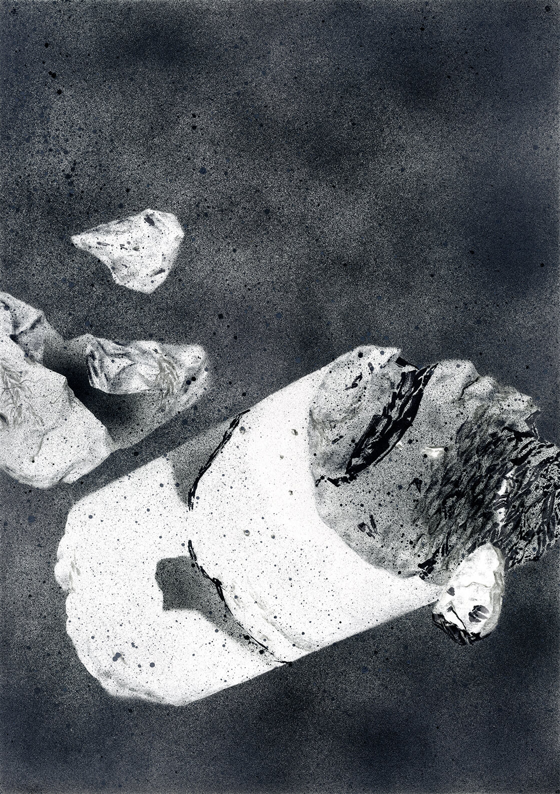 The study of core samples provides scientists with essential information about the geological characteristics and coal distribution of specific regions. Coal is formed through the burial and transformation of carbon from plants which died millions of years ago, converted from peat and into coal through time and geologic pressure. In drawings, the cylindrical core sample appears to float as if defying gravity, with layers containing fossils of Lycopodium, ferns, and traces of coal. The grayscale background reflects the evolutionary processes of various materials within the geological strata. The ruler depicted in the piece not only measures the size of objects but also symbolizes the transmutation from ancient swamps to modern minerals.