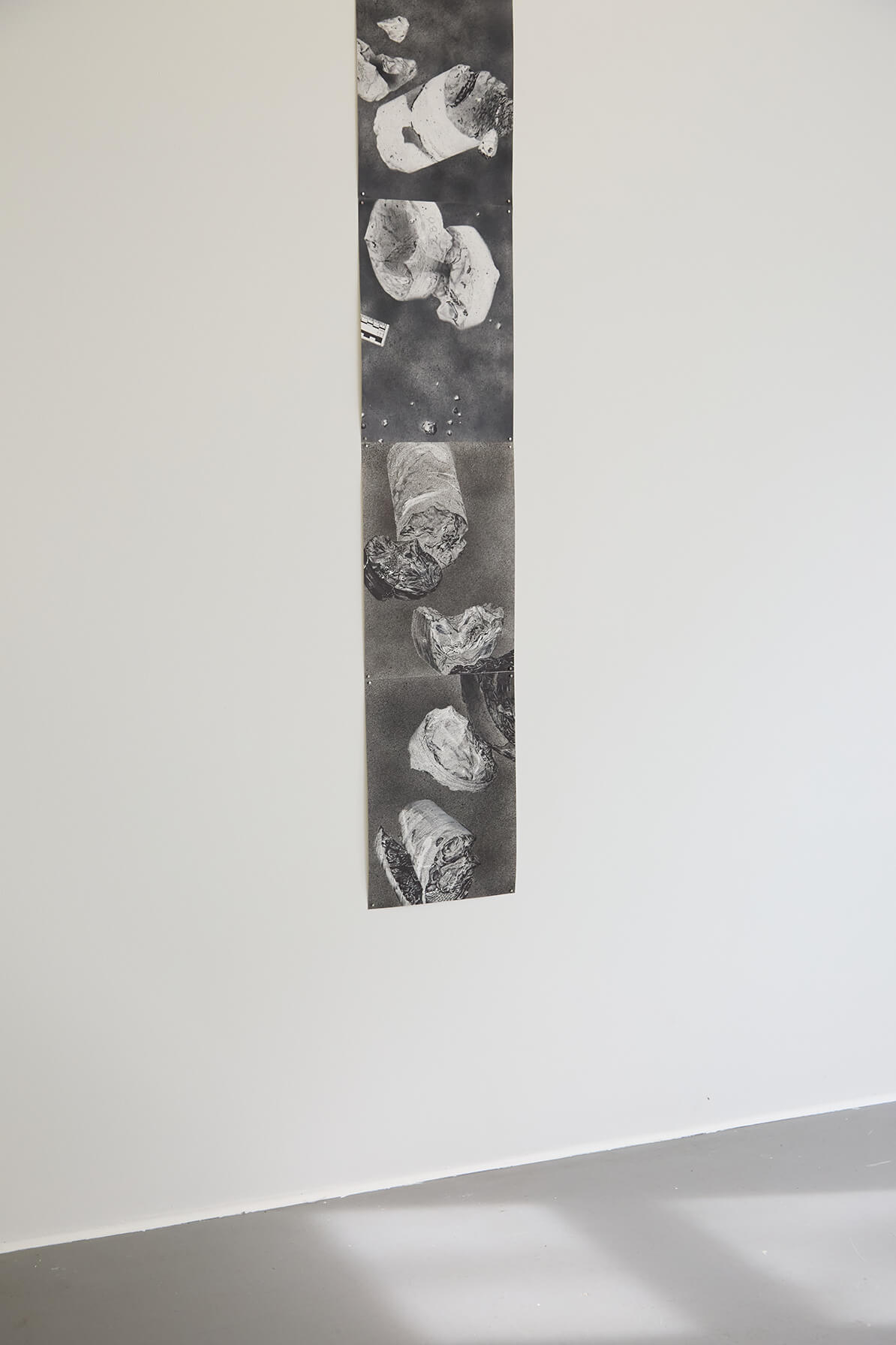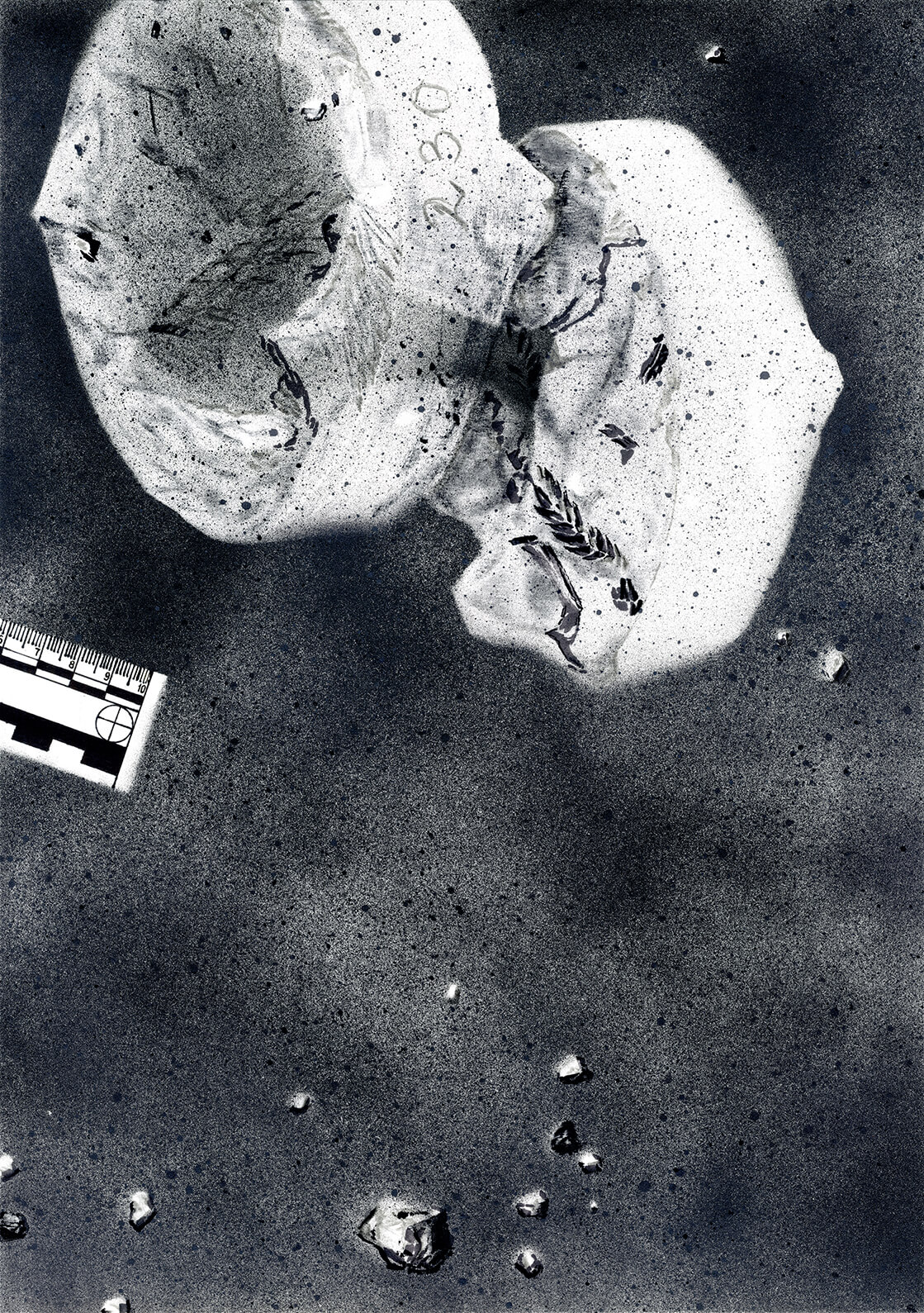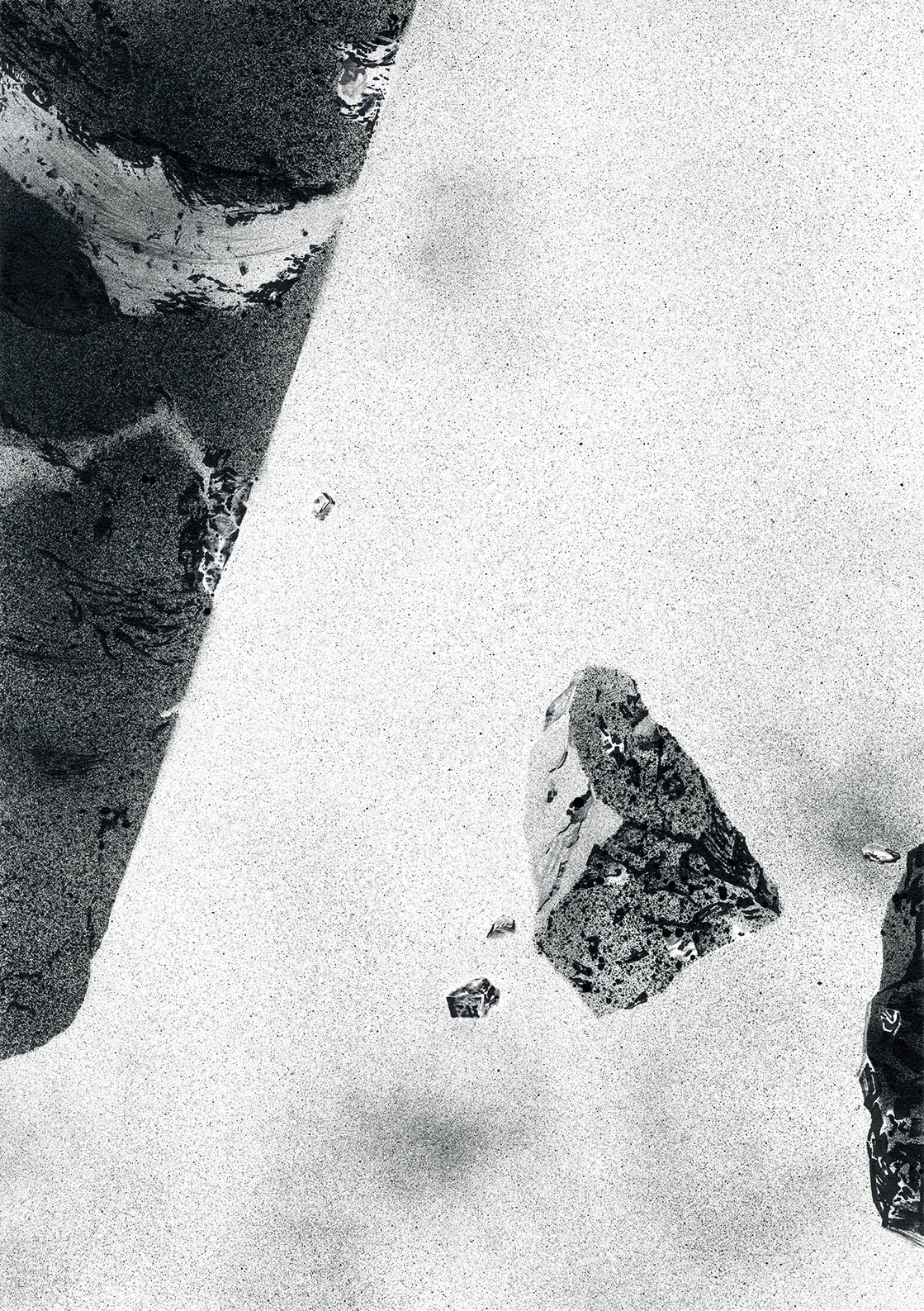 The study of core samples provides scientists with essential information about the geological characteristics and coal distribution of specific regions. Coal is formed through the burial and transformation of carbon from plants which died millions of years ago, converted from peat and into coal through time and geologic pressure. In drawings, the cylindrical core sample appears to float as if defying gravity, with layers containing fossils of Lycopodium, ferns, and traces of coal. The grayscale background reflects the evolutionary processes of various materials within the geological strata. The ruler depicted in the piece not only measures the size of objects but also symbolizes the transmutation from ancient swamps to modern minerals.